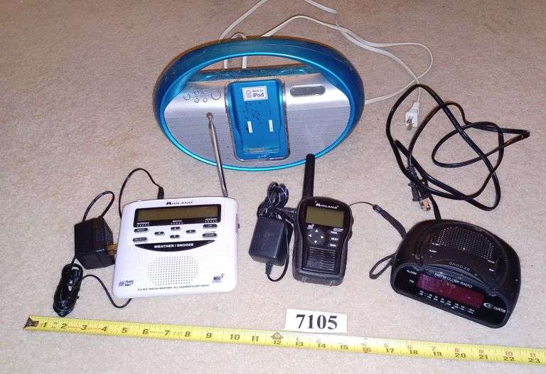 Two Midland weather radios, iPod dock, clock radio. Location: living room
