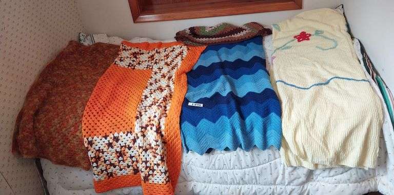 Yellow Chenille bedspread, crocheted blankets and throws. Location: 3 season room