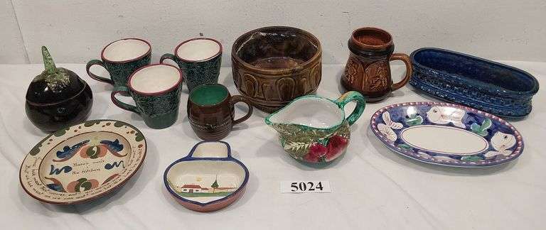LOT 5024 - Ceramic and pottery planters, mugs, bowls, eggplant covered dish, pitcher, etc