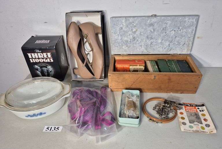 Sewing machine attachments, theatre shoes, vintage Fire King casserole dish, Three Stooges DVD collection, Etc