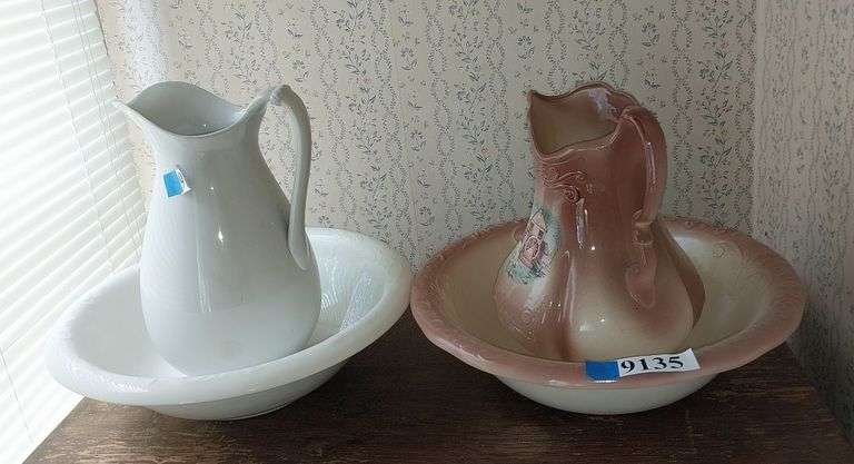 Ironstone Pitcher and Bowl set, ironstone pitcher and mismatched bowl. Location: 2nd floor hall right alcove
