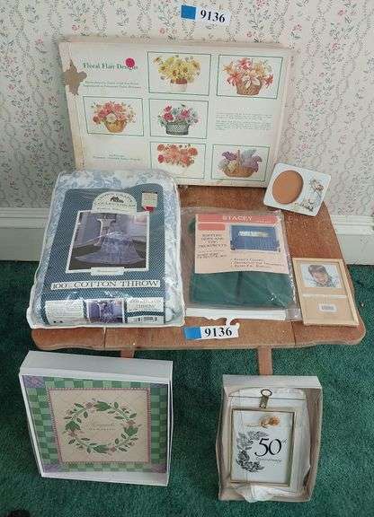 Photo album, frames, NIP cotton throw, valance, vintage floral plastic placemats. Location: 2nd floor hall