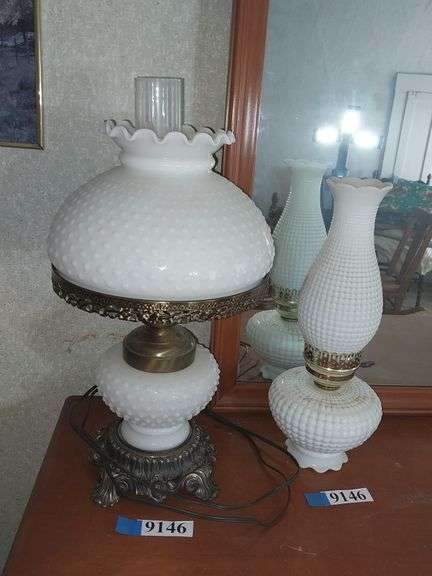 2 Milk glass Lamps. It appears the base is a shade upside down. It is a bit wobbly. Location: 2nd floor BR 4