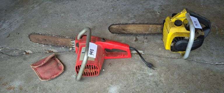 Small older McCulloch chainsaw, small electric chainsaw. The McCulloch chainsaw has an oil leak. Location: garage