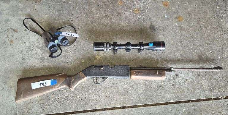 Air gun, scope, Minolta compact binoculars. Location: garage