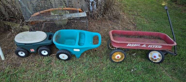 Radio Flyer wagon, gardening cart, Little Tikes garden cart. Location: backyard