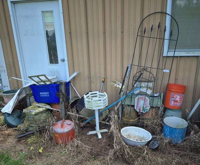 Cleaning rights to items in area outside garage including Graniteware pans, planters, Garden trellis, golf clubs, etc. Take what you want, leave the rest neatly behind. Location: backyard