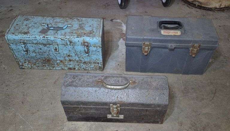 Three tool boxes. Please note: These items have been in a damp basement and may have a smell and/or require cleaning. Location: basement workshop