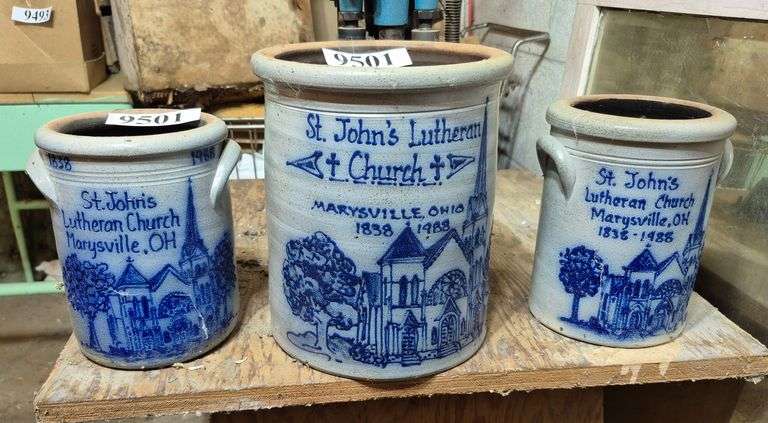 Three contemporary blue decorated St John's Lutheran Church Crocks. Please note: These items have been in a damp basement and may have a smell and/or require cleaning. Location: basement workshop