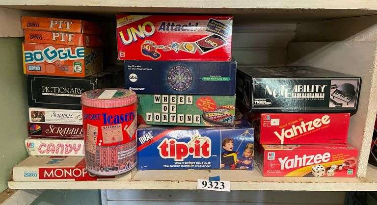 Vintage and newer board games, dominoes, bingo cage, Scrabble books. Location: hall cupboard