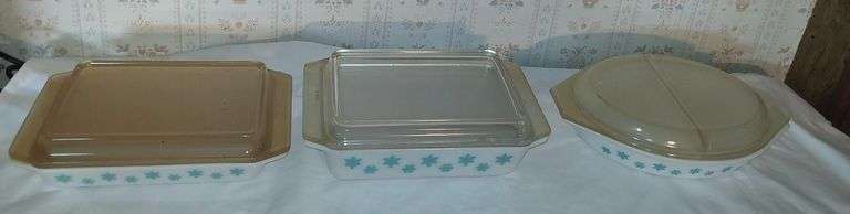 3 Pyrex Snowflake baking dishes. Location: kitchen