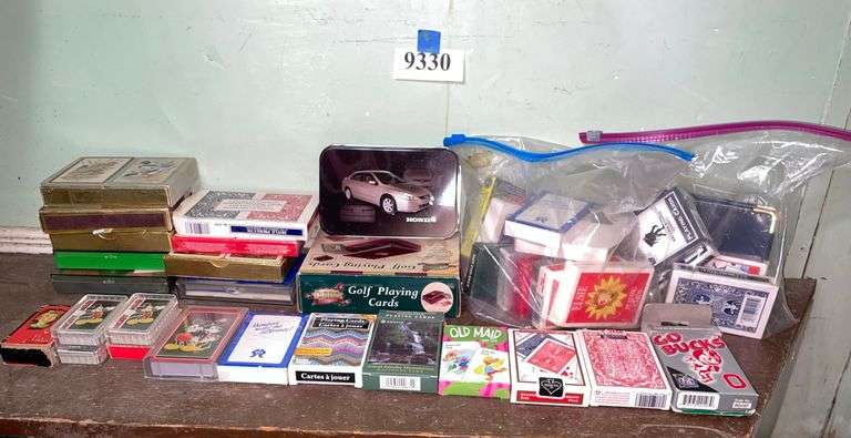 Many playing cards, golf-themed wood card holder, card holder booklet with pen and notepad. Location: back hall closet