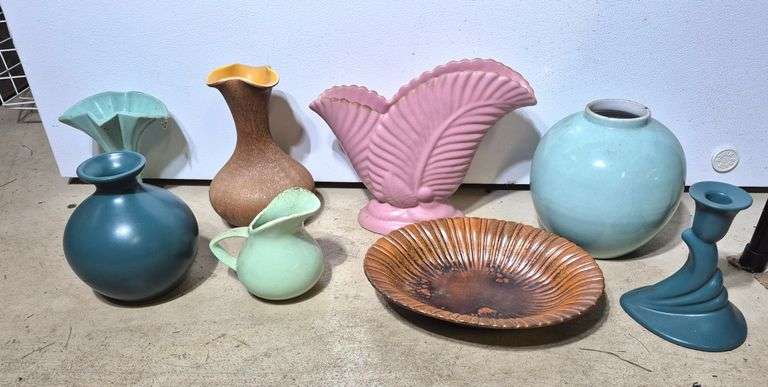 Pottery vases, bowl, pitcher, candle holder, Etc. Please note: These items have been in a damp basement and may have a smell and/or require cleaning. Location: basement workshop