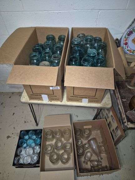 Lots of canning jars. The two boxes on top of the table are two layers deep. Please note: These items have been in a damp basement and may have a smell and/or require cleaning. Location: main basement