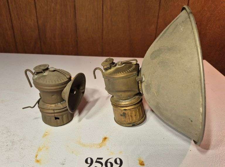 Two antique miners carbide lamps. Please note: These items have been in a damp basement and may have a smell and/or require cleaning. Location: main basement
