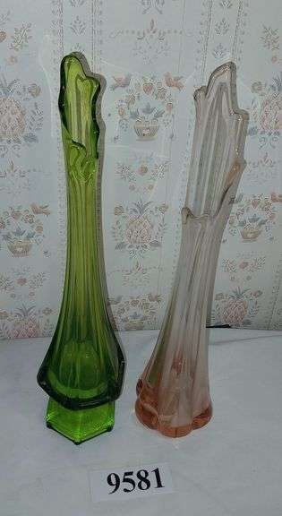 LOT 9581 - Green and Peach colored Stretch glass vases