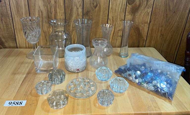 Glass vases, spooner, decorative glass stones, flower frogs. Location: kitchen