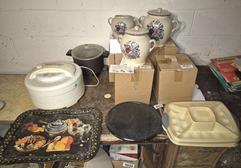 New home and garden party stoneware, food dehydrator, deep fryer, tray, lazy susan, food container. Please note: These items have been in a damp basement and may have a smell and/or require cleaning. Location: main basement