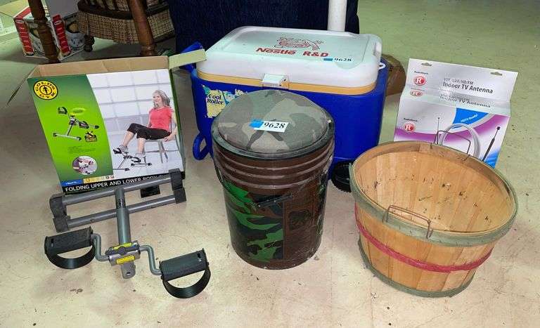 Cooler, indoor tv antenna in box, camouflage bucket with cushione seat, upper/lower body cycle, etc. Please note: These items have been in a damp basement and may have a smell and/or require cleaning. Location: main basement