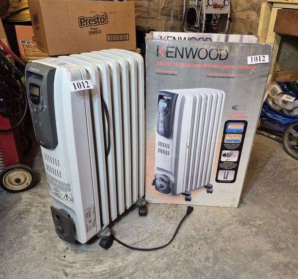 Kenwood oil-filled rolling space heater with digital display in original box, working. Location: garage