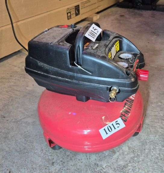 Central Pneumatic 3 gallon oilless 100 max PSI pancake air compressor, working well. Location: garage