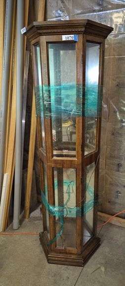 Lighted curio cabinet with glass shelves. One glass panel on top left side is broken, minor finish where as shown in detail photos. Glass panel is easy to replace from inside. Location: garage