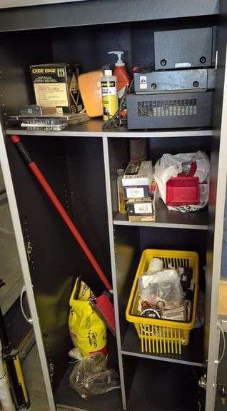 Contents of cabinet including stereo components, Harley-Davidson parts, broom, cat litter, hardware, hand cleaner, battery, Hardware bins, Etc. Cabinet sold separately above. Location: Garage
