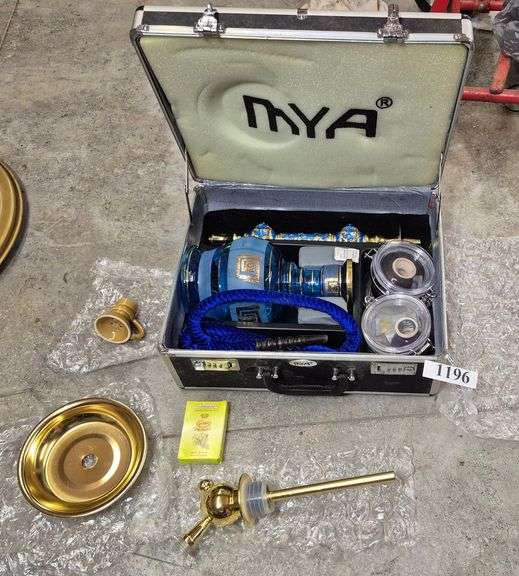 Mya hookah set in case, apparently unused. I had to pry the case open, so the case no longer closes. Location: Garage