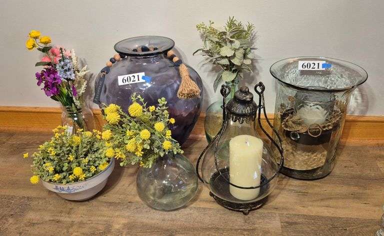 LOT 6021 - Glass vases, candle lantern, crock bowl, artificial flowers