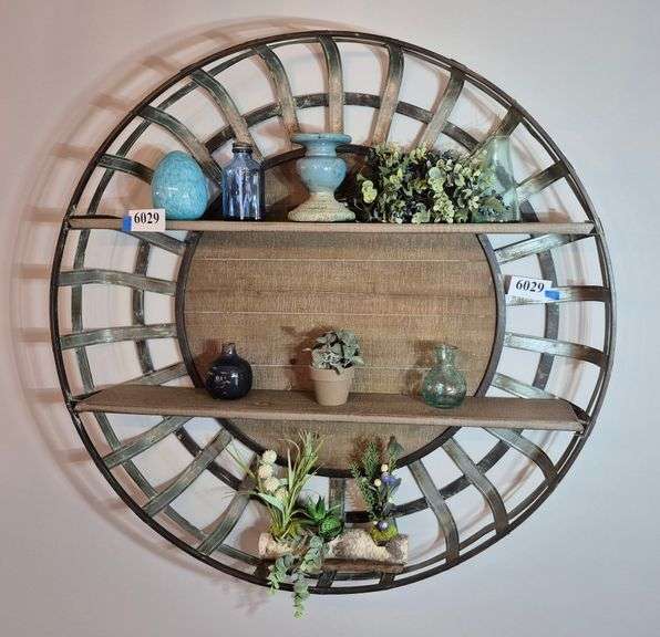 LOT 6029 - Wall hanging what-not shelf with glass and ceramic decor, artificial greeery