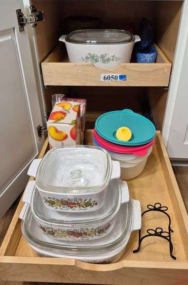 Contents of cabinet including Corning baking dishes, Tupperware, Christmas dishes, pottery bowls, Etc. Location: kitchen
