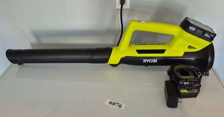 LOT 6076 - Ryobi 18 volt cordless yard blower with battery and charger and weed trimmer