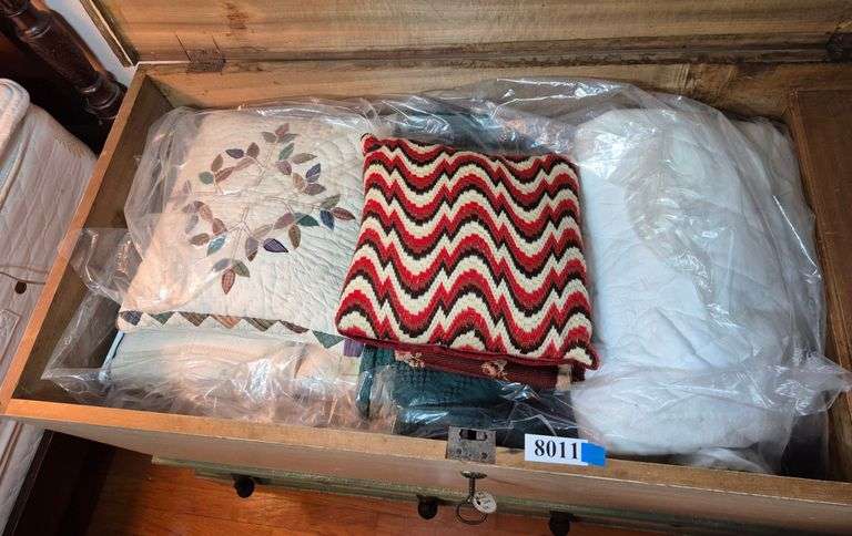 Contents of blanket chest including comforter, blankets, mattress pad, pillows, bedspread, Etc. Location: 2nd floor BR 1