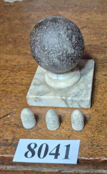 LOT 8041 - Civil War era artillery ball on marble pedestal, three MiniƩ balls.