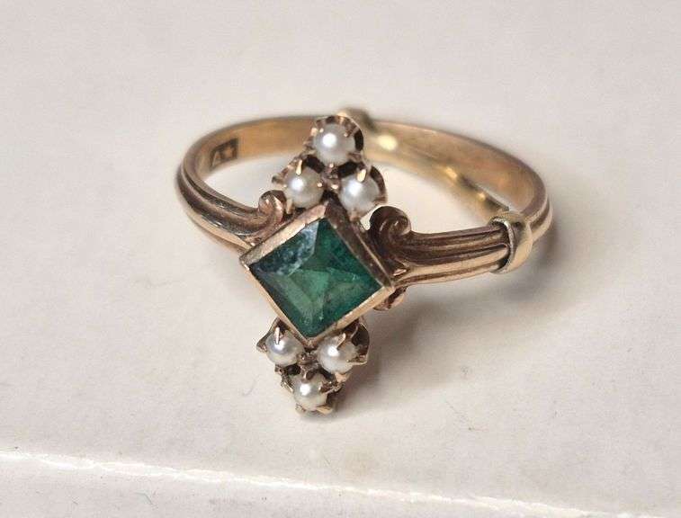 Antique gold ring with green gemstone (emerald ?) and accent opals. Makers mark comes back to Allsop Bros. Corner Orchard and Camp Streets, Newark, NJ; 1894-1937. Purity unknown. Approximate size 5 with sizer, would be larger with sizer removed. Total weight 2.16 grams.